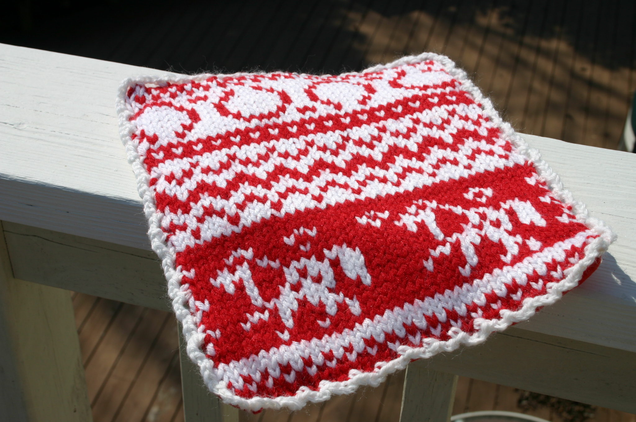 To make this potholder, CO 80 stitches on 4mm needles with red (or choice color). Work remaining chart back and forth. Right sides facing inward, sew fabric to chart. Leave a gap at the bottom, turn right side out, and hand sew gap. Optional: add crochet border. This pattern is inspired by DROPS Pot Holder.